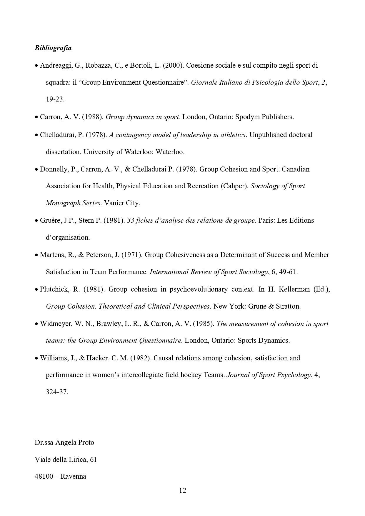 - integrazione di gruppo sul compito (es. “La nostra squadra è unita nel cercare di raggiungere i suoi obiettivi di prestazione”);