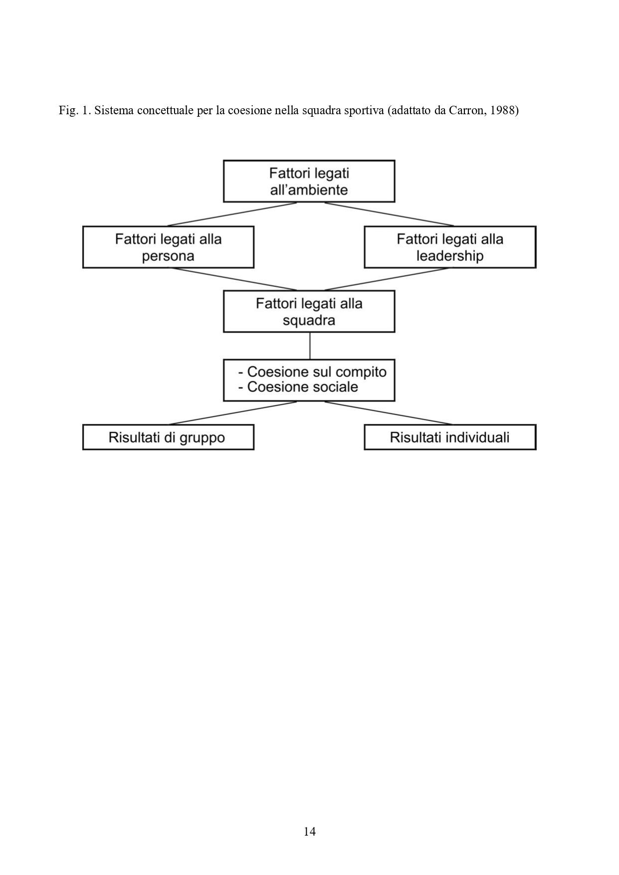 Alcune delle caratteristiche strutturali che più incidono sulla coesione in una squadra sportiva sono: la dimensione, la prossimità fisica, la permeabilità, la differenziazione dei ruoli, la suddivisione in sottogruppi e il flusso di informazioni (Plutchick, 1981). Rispetto alla coesione, le teorie che ritroviamo in letteratura sono molteplici; il modello di Carron (1988) è il più conosciuto. Questo modello, rappresentato nella figura 1, parte dalla premessa che la coesione nelle squadre sportive può essere relativa al compito e/o ai rapporti sociali all’interno del gruppo, e prevede quattro categorie di variabili ordinate gerarchicamente che contribuiscono al suo sviluppo: ambiente o situazione, caratteristiche personali, leadership, e squadra.