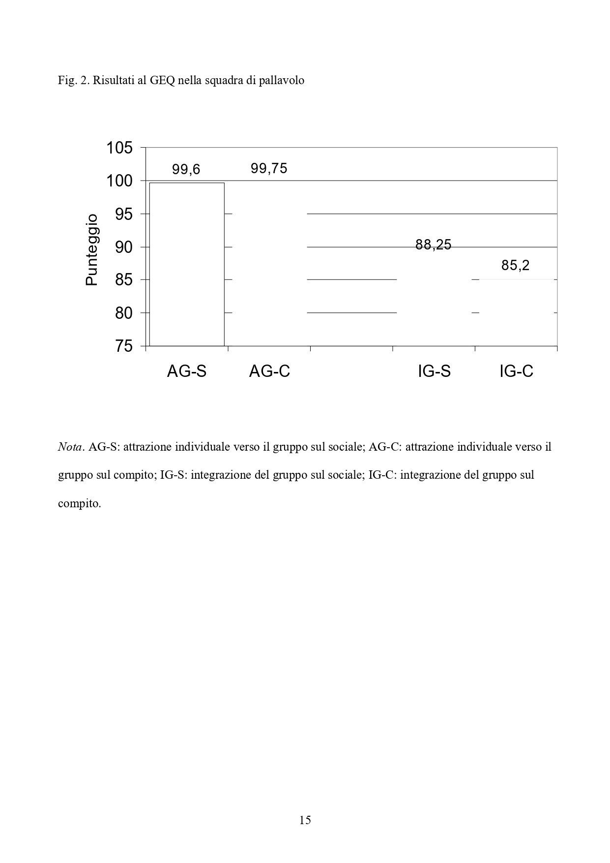 Il secondo strumento somministrato alla squadra è il “Group Environment Questionnaire” (GEQ) (Widmeyer, Brawley e Carron, 1985, tradotto e adattato da Andreaggi, Robazza e Bortoli, 2000). Gli autori hanno considerato la coesione come costrutto multidimensionale comprendente la coesione sul compito, riferita all’attività del gruppo in relazione al conseguimento degli obiettivi, e la coesione sociale, interente lo sviluppo e il mantenimento di relazioni interpersonali soddisfacenti. Sono inoltre identificati altri due aspetti: l’integrazione del gruppo, ovvero la percezione del collettivo come globalità da parte dell’individuo, e l’attrazione individuale verso il gruppo, ossia l’interesse che l’individuo ha verso il collettivo. L’integrazione e l’attrazione individuale verso il gruppo possono riguardare aspetti inerenti il compito o il sociale. Gli item del GEQ sono 18 e le sottoscale sono quattro:
